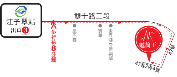 經銷據點 電筒王目前網路購物為 http://www.wii.tw 若有需要現場購買 可以到我們各地的經銷點 若您有實體店面,欲加入電筒王的經銷點 mail聯絡:wii@wii.tw 我們會有專人跟您聯繫 營業時間星期一~星期五:10:00~20:30 星期六:11:30~20:30 星期日:11:30~20:30 公司地址220 新北市板橋區雙十路二段47巷2弄4號1樓 (捷運江子翠站3號出口附近) 你還可以在以下的地點買到電筒王的商品 | 專櫃據點 桃園中壢新屋店翔準軍品生存遊戲電筒王手電筒全系列周一到周五 12:00-22:00周六日 11:00-22:00327桃園市新屋區民族路六段239號TEL:03-4204629桃園蘆竹南崁店翔準軍品生存遊戲電筒王手電筒全系列周一到周五 12:00-22:00周六日 11:00-22:00338桃園市蘆竹區六福路155號TEL:03-3129132彰化和美店翔準軍品生存遊戲電筒王手電筒全系列周一到周五 12:00-22:00周六日 11:00-22:00508彰化縣和美鎮彰新路二段479號TEL:04-7353481高雄湖內店翔準軍品生存遊戲電筒王手電筒全系列周一到周五 12:00-22:00周六日 11:00-22:00829高雄市湖內區中山路二段138號TEL:076994196高雄鳳山店翔準軍品生存遊戲電筒王手電筒全系列周一到周五 12:00-22:00周六日 11:00-22:00830高雄市鳳山區紅毛港路486號TEL:07-7925312