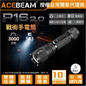 ACEBEAM P16 2.0 3000流明 543米 雙尾按戰術手電筒 戰術/日常/特殊三模式 攻擊頭 TYPE-C 18650