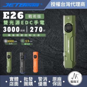 JETBeam E26 3600流明 230米 戰術EDC手電筒 白光+綠光束+UV光 尾按戰術開關 可拆卸背夾