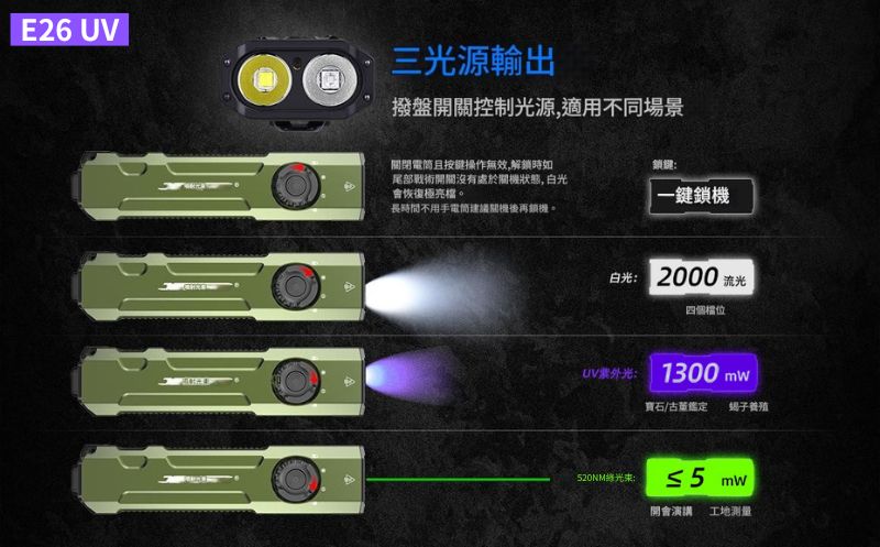 ◆(UV光版)三種燈光模式,自由變換(白光源+綠激光+UV光)