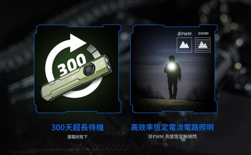 除了雙白光外,還配有5mW綠激光,可同時開啟。配備1700mAh電池,外殼為航空級鋁材,IPX8防水等級。