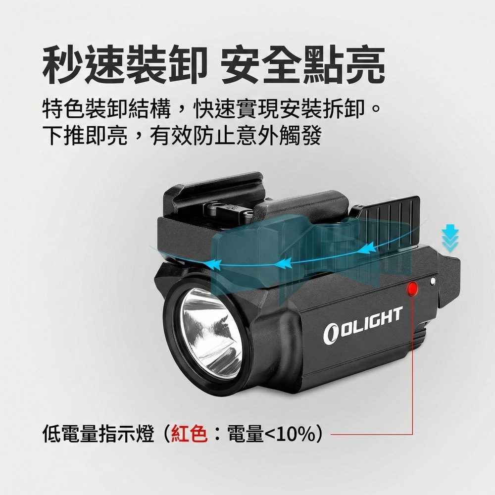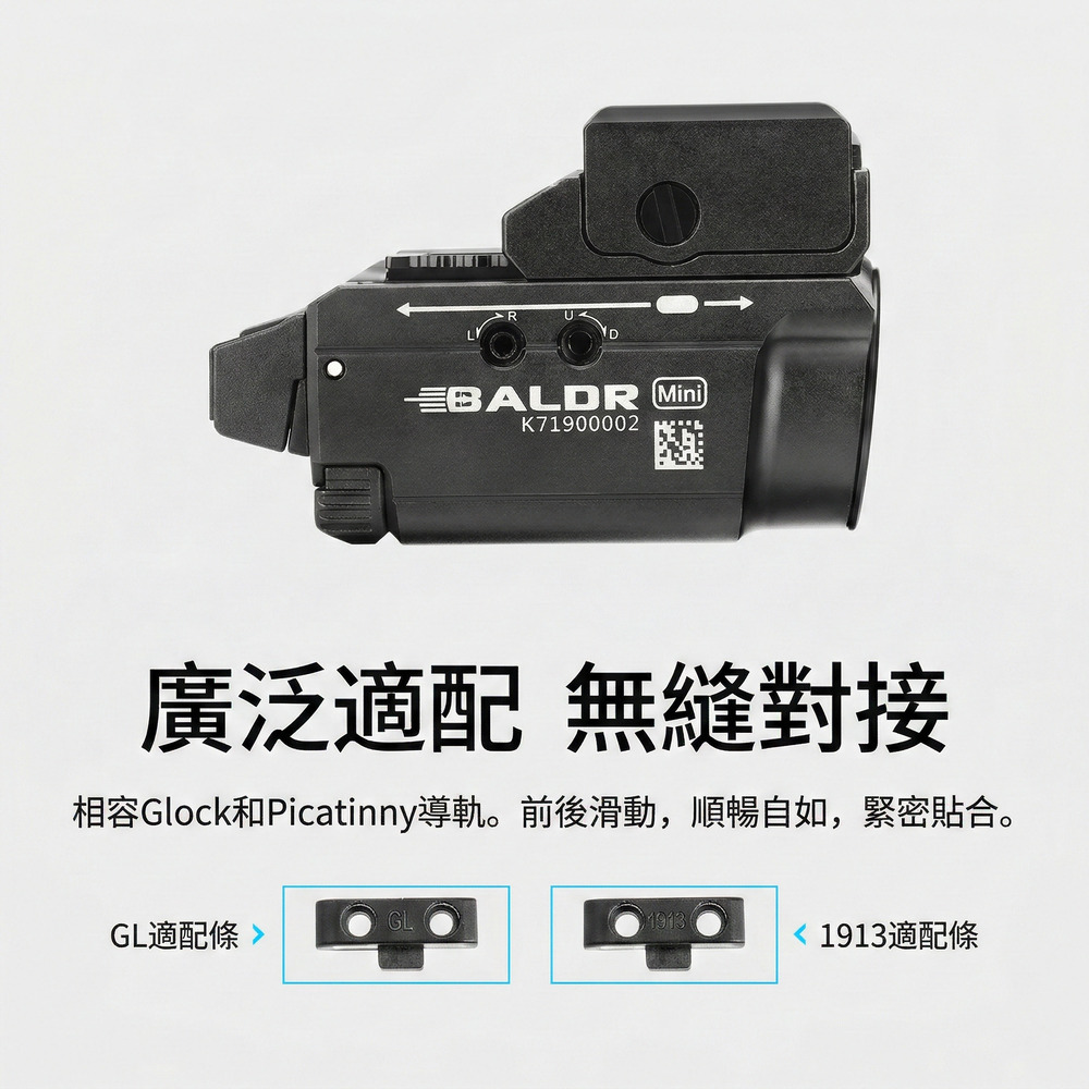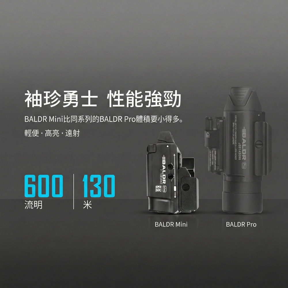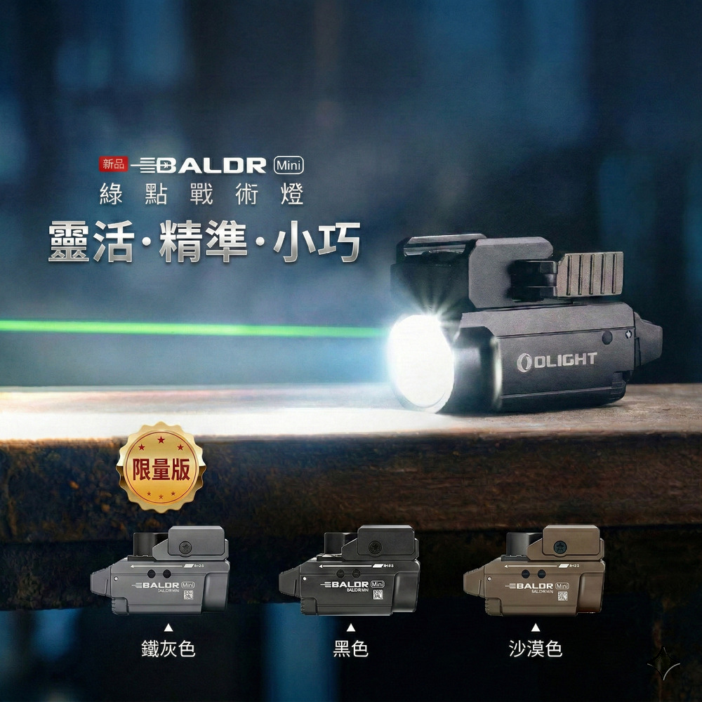 Olight Baldr Mini 結合了高亮度白光與高可見度綠點,是專為生存遊戲與專業戰術需求打造的極致輕量化裝備。緊湊的體積蘊藏強大火力,搭配獨創的可調滑軌設計,完美貼合您的愛槍。