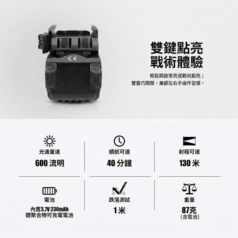 - 強悍輸出與三種模式:最高 600 流明白光輸出,射程達 130 米。支援白光、綠點、綠點+白光三種戰術模式隨意切換。