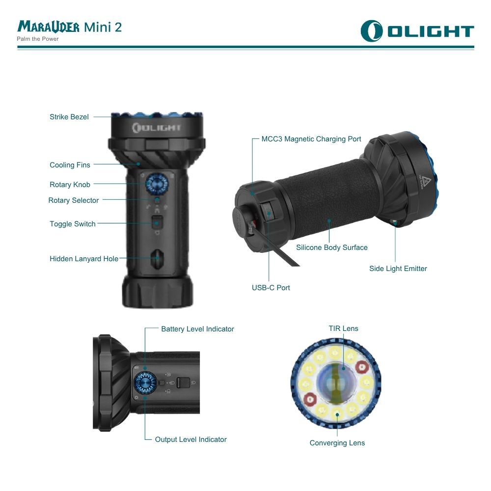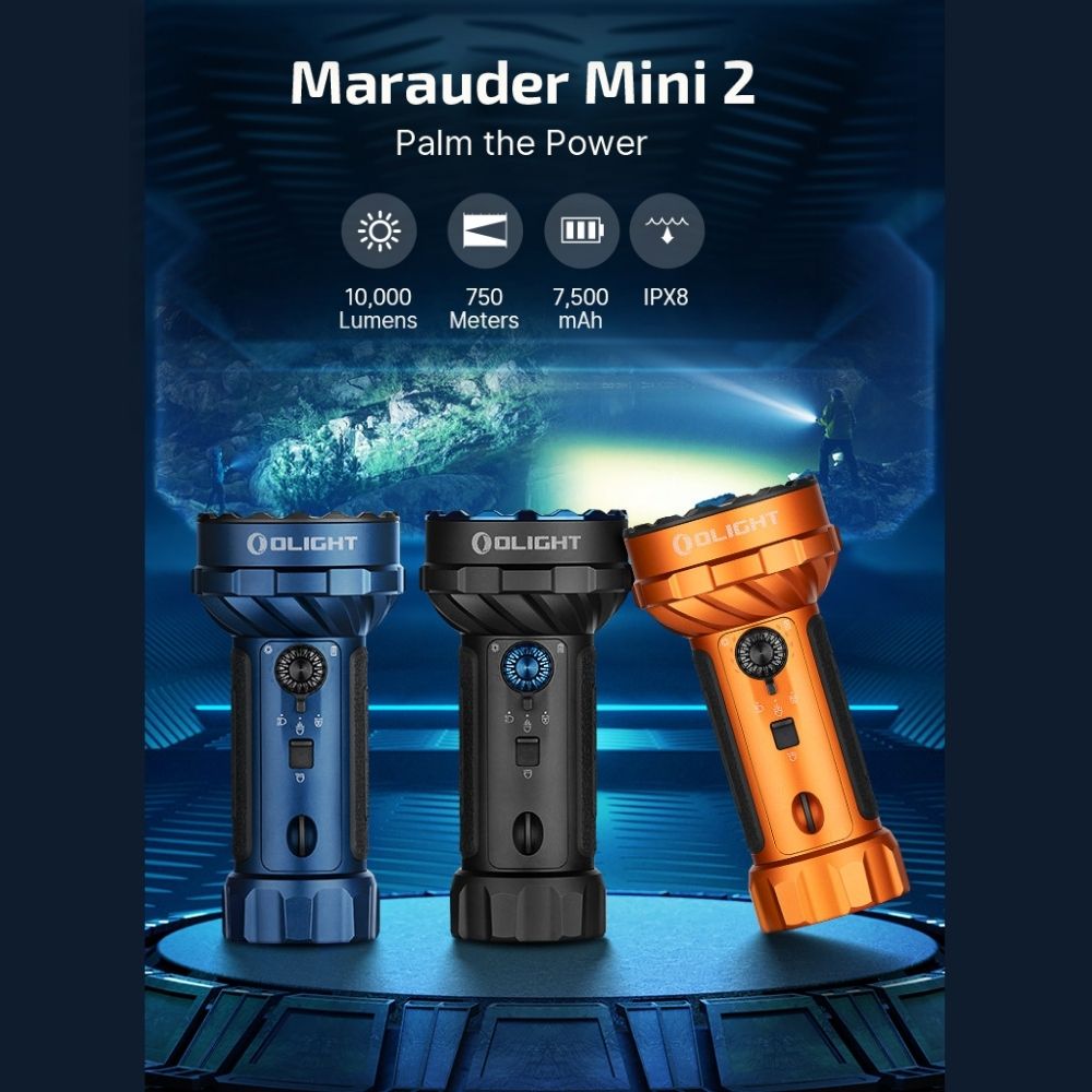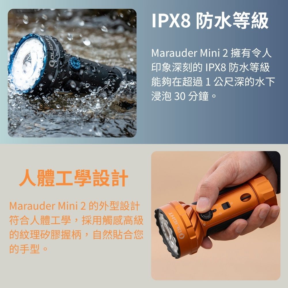 Marauder Mini 2 是一款緊湊卻功能強大的多用途手電筒,提供五種照明模式:強光泛光、聚焦聚光、雙光源組合、紅光與側燈,滿足從日常使用到戶外探險的多重需求。最高亮度達 10,000 流明,照射距離可達 750 公尺,讓您在任何環境下都能清晰視野。內建 7500mAh 大容量電池,續航最長可達 20 天,並支援 USB-C 充電。具備 IPX8 防水等級與防滑矽膠握柄設計,操作直覺、握感舒適,是征服野外與日常照明的完美夥伴。