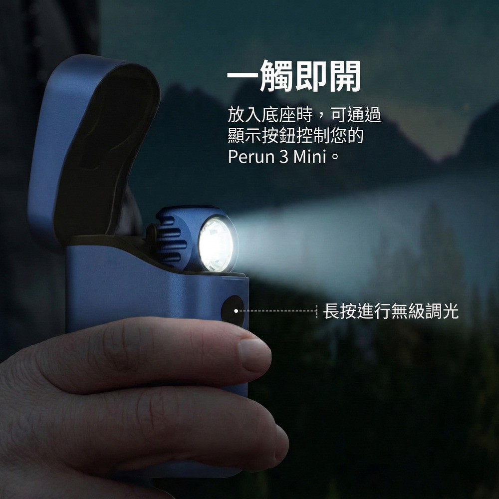 多功能收納盒設有數位電源鍵,可直接開啟手電,長按還可無段式調光,即便在充電時也能操作。此外,兼容Baton 4、Baton 3、Perun 2 Mini、Perun Mini和S1R II等型號。