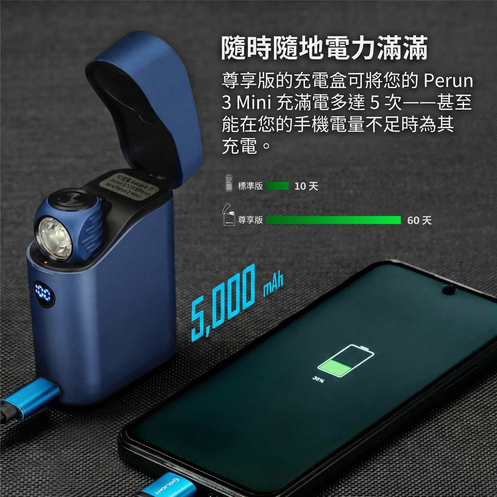 配備5000mAh大容量電池,收納盒可為Perun 3 Mini充滿最多5次,最長續航時間可達60天。內建USB-C端口,外出時也能為手機充電。