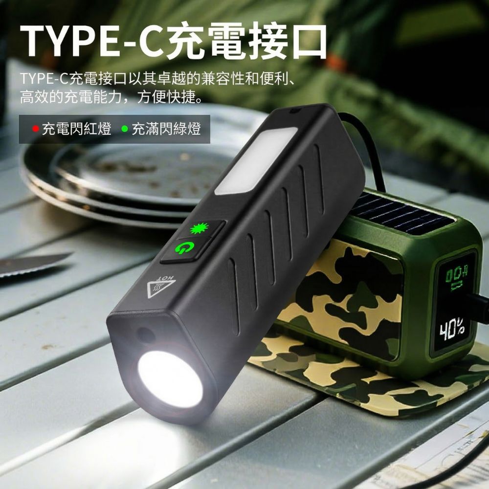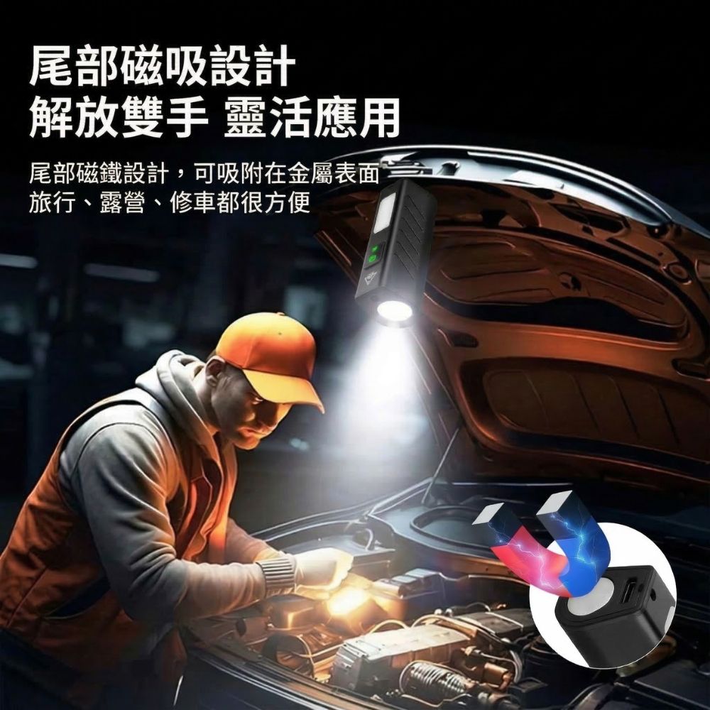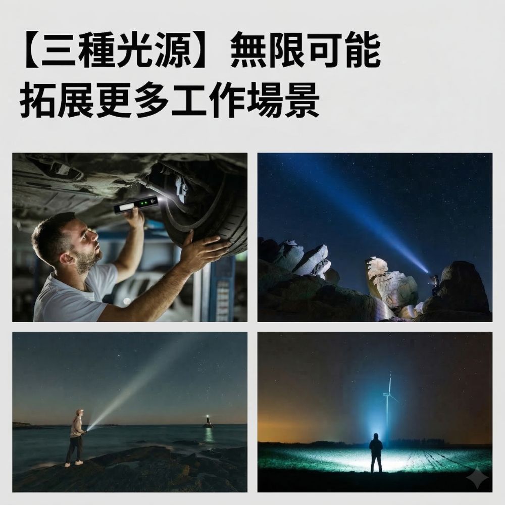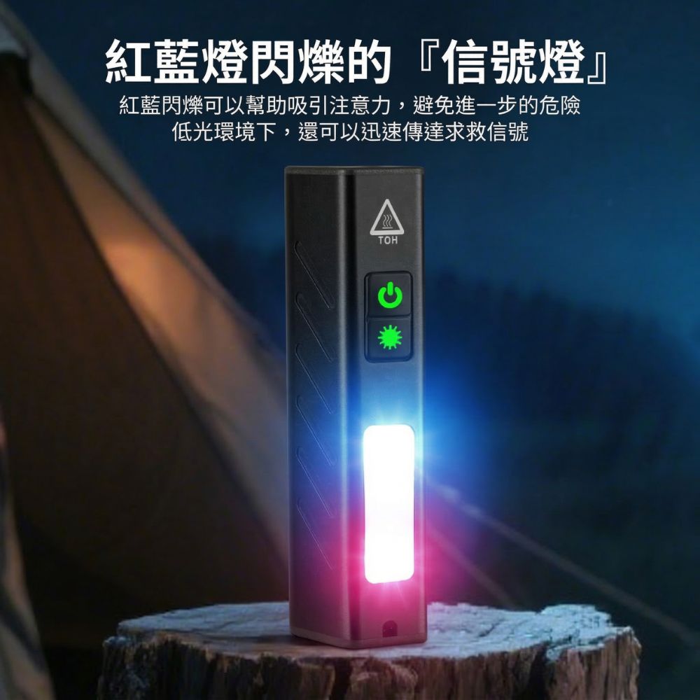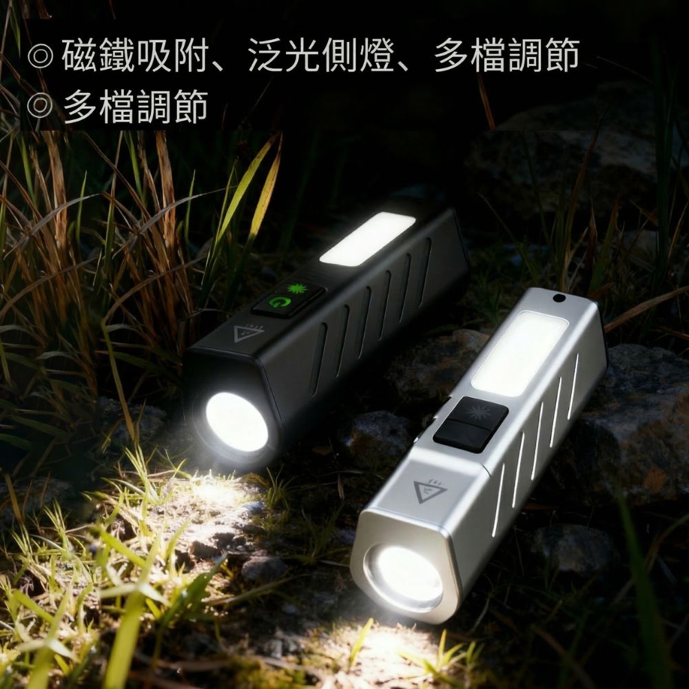 這款多功能 COB 強光手電筒是您戶外露營、夜間行走、車輛維修以及應急求生的最佳夥伴。突破傳統手電筒的體積限制,將高亮度照明濃縮在僅約 45 克的輕巧機身中。