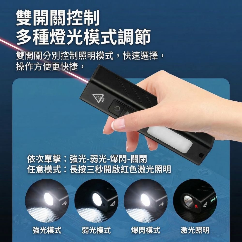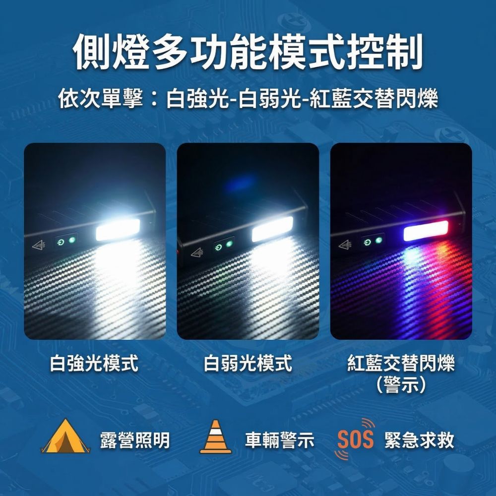 強光、弱光、爆閃模式一鍵切換,應對不同緊急狀況。